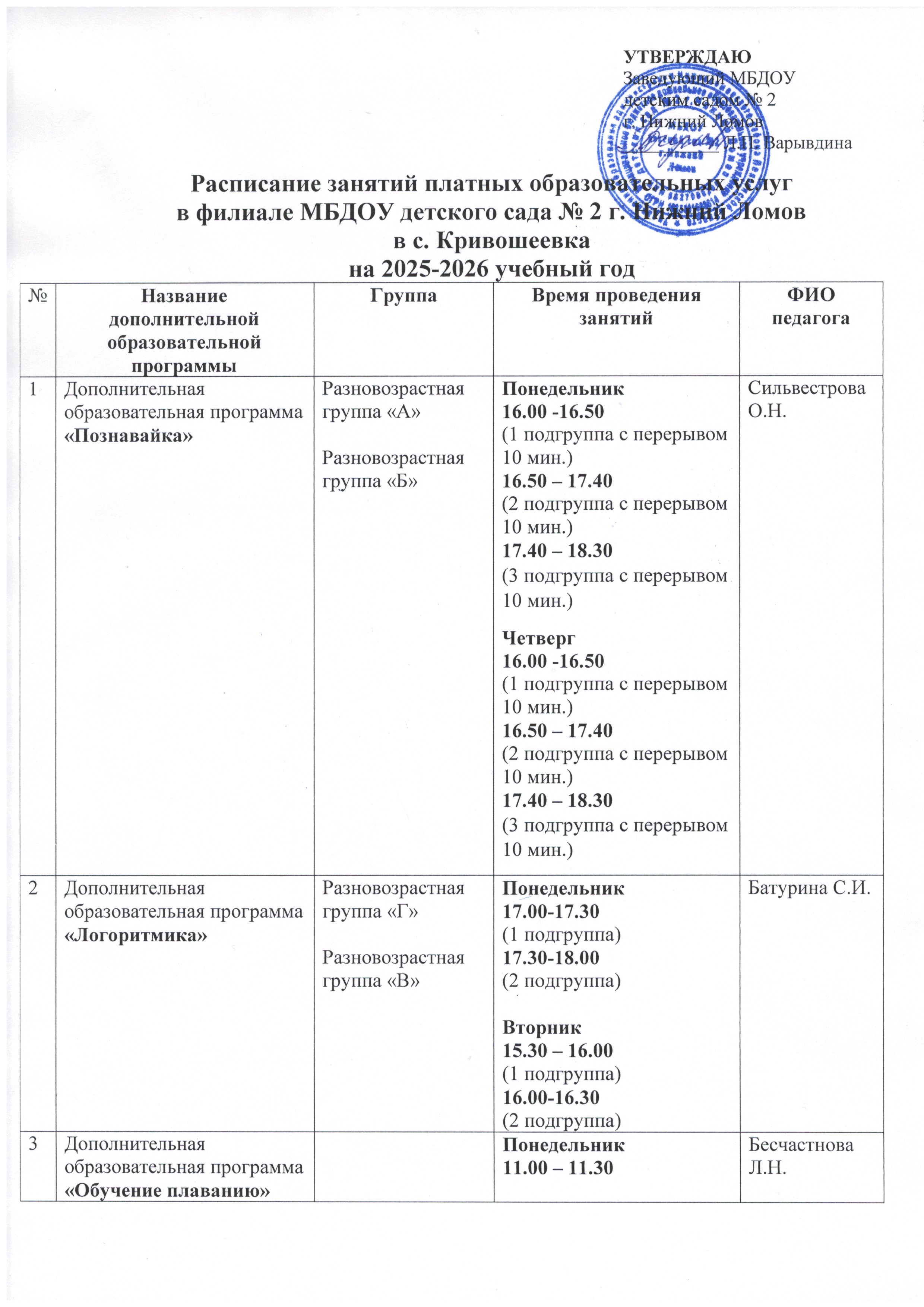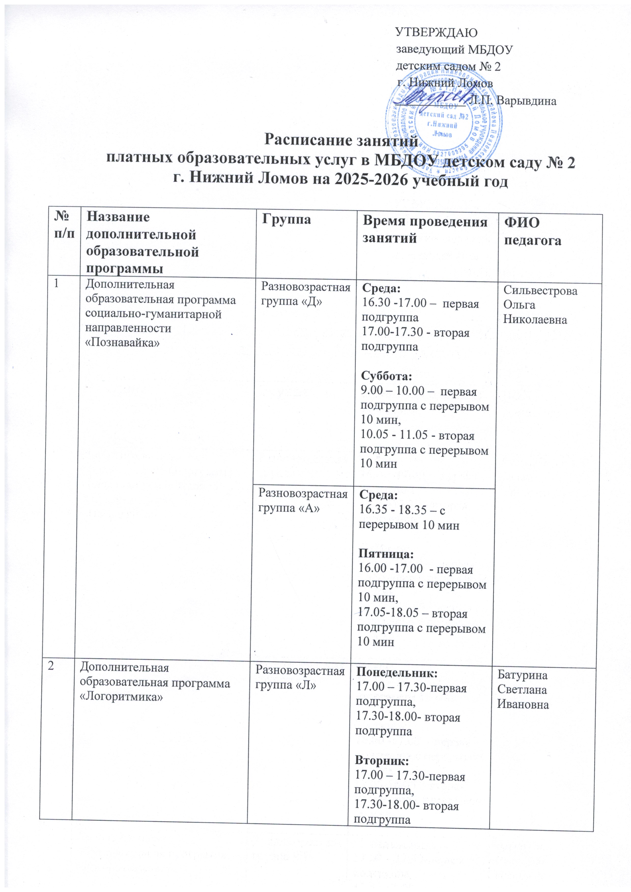 Расписание занятий платных образовательных услуг МБДОУ детского сада №2 г. Нижний Ломов