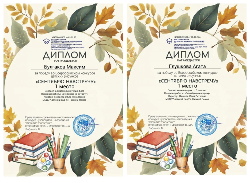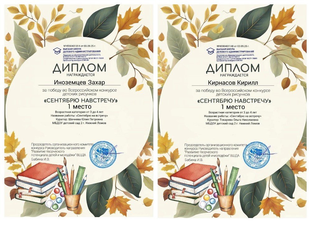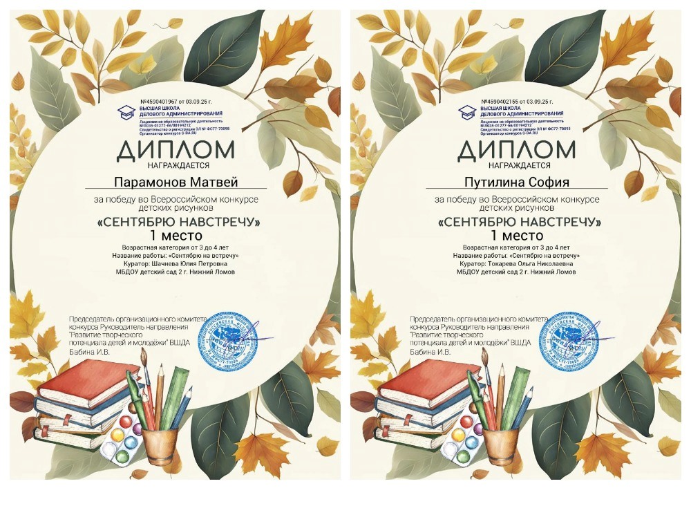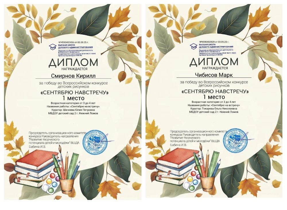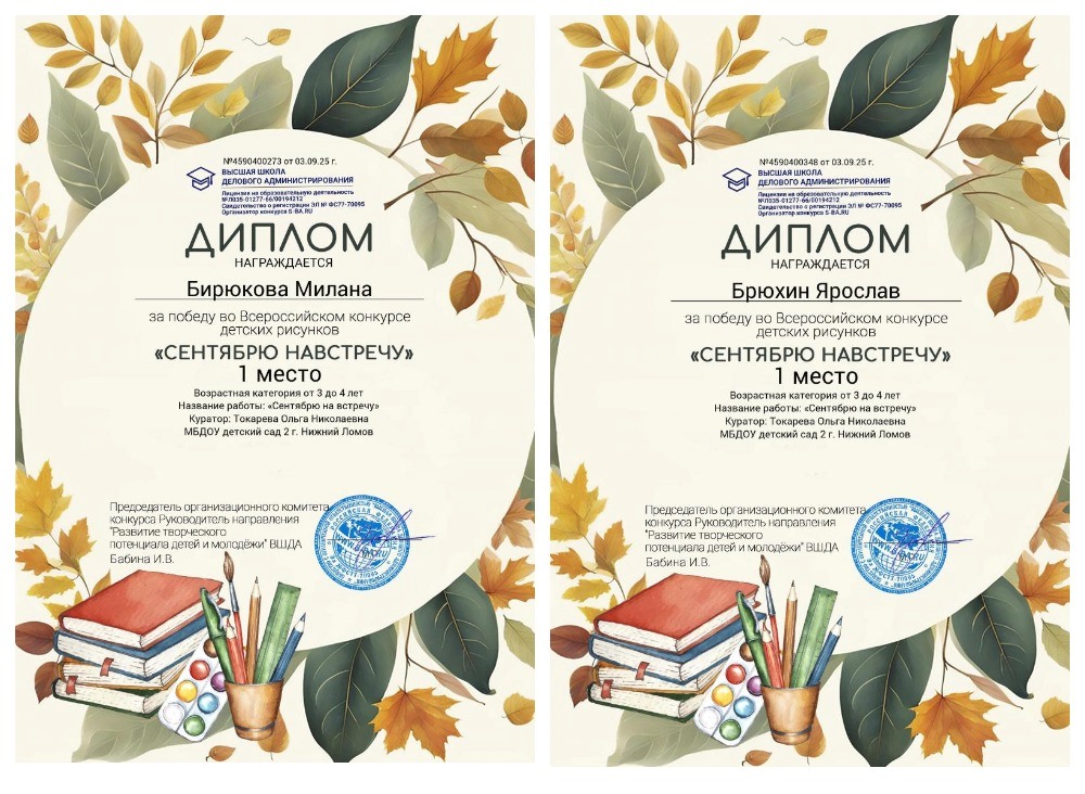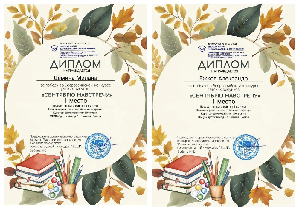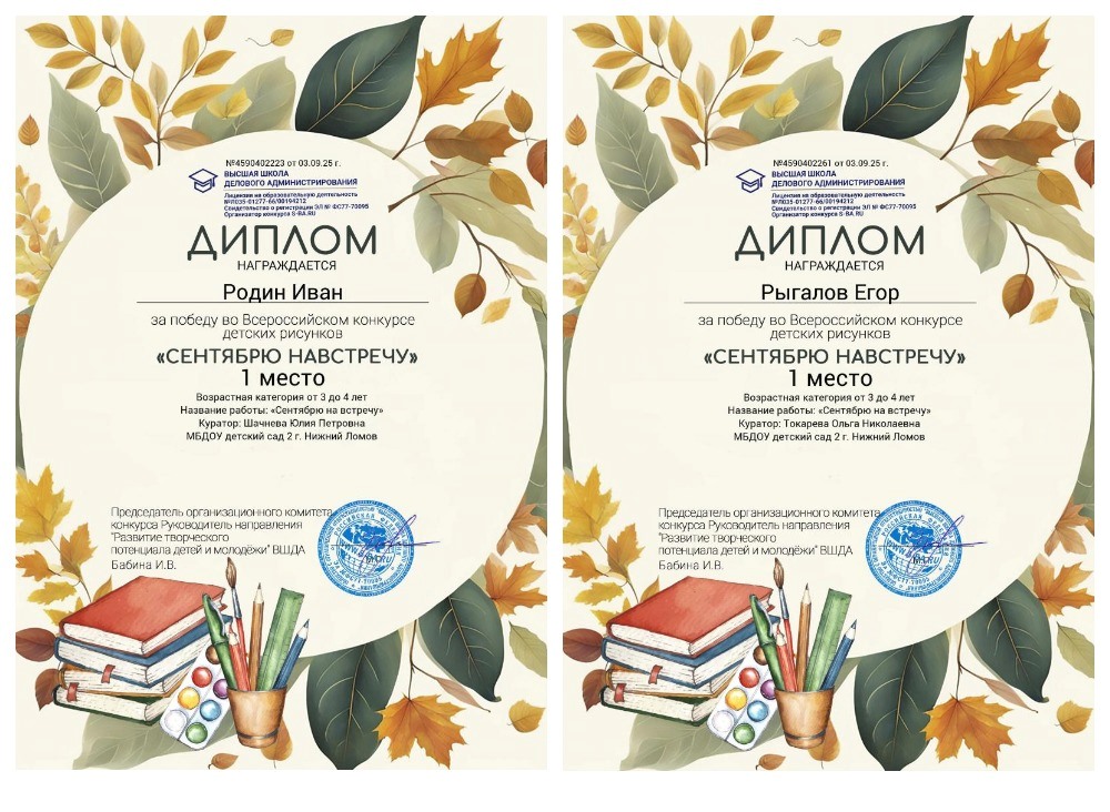 Подведены итоги Всероссийского конкурса детского рисунка "Сентябрю навстречу".Поздравляем юных художников, ребят из группы "Пчелка", с победой! Желаем им дальнейших творческих успехов!