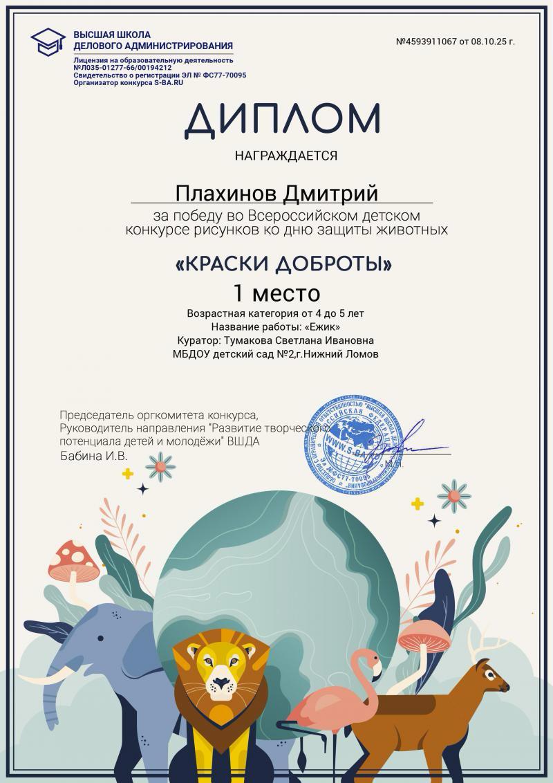 Воспитанники группы "Золотая рыбка" нашего детского сада приняли участие во Всероссийском конкурсе рисунков ко Дню защиты животных "Краски доброты". Лучшие работы отмечены дипломами. Поздравляем ребят с победой! Желаем нашим маленьким художникам ярких идей и дальнейших творческих успехов!