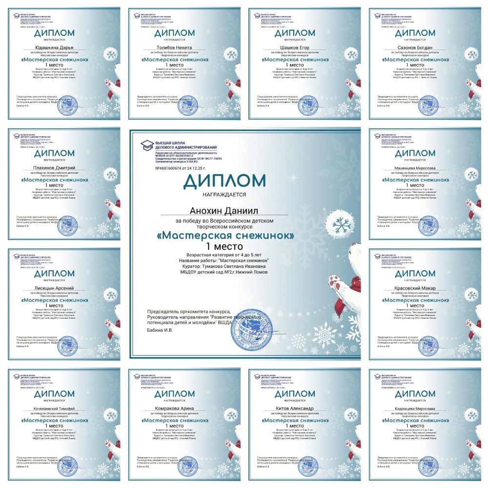 Подведены итоги Всероссийского детского творческого конкурса "Мастерская снежинок", в котором приняли участие воспитанники средних групп "Медвежонок" и "Золотая рыбка". Поздравляем победителей, желаем дальнейших успехов и новых побед!