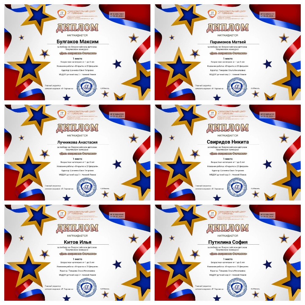 Подведены итоги Всероссийского детского творческого конкурса "День защитника Отечества", в котором приняли участие воспитанники группы "Пчелка". Поздравляем победителей, желаем дальнейших успехов и новых побед!