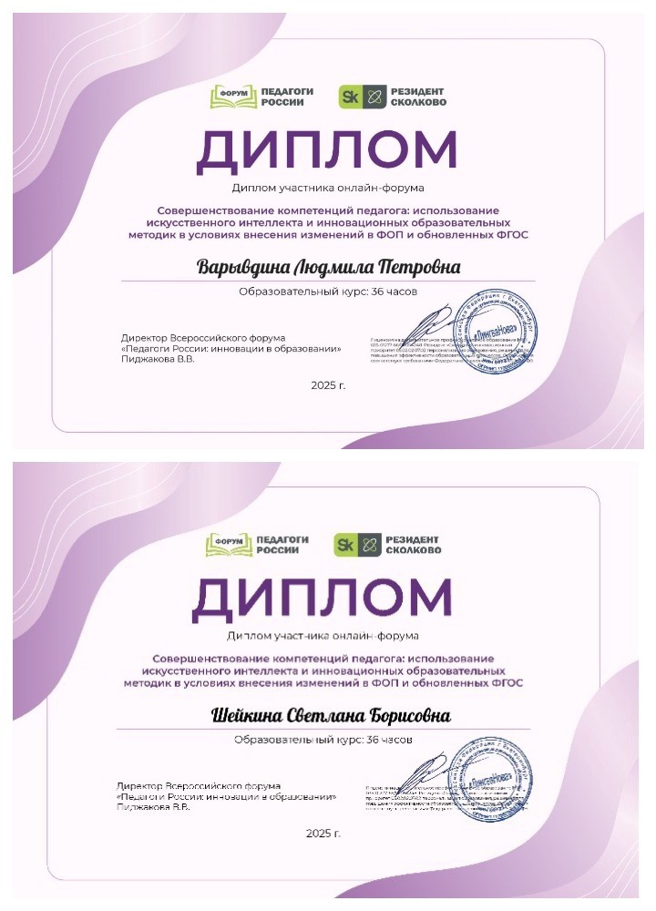 Педагоги нашего детского сада приняли участие в онлайн-форуме «Педагоги России: инновации в образовании» по теме «Совершенствование компетенций педагога: использование искусственного интеллекта и инновационных образовательных методик в условиях внесения изменений в ФОП и обновлённых ФГОС». По итогам мероприятия педагоги получили дипломы участников онлайн-форума. Поздравляем!